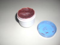この紫雲膏の見た目は、とても赤くいかにも漢方といった感じがします^^; そして手にとってみると、ザラザラしてベットリとし馬油とは正反対な感じです。紫雲膏は以下のような感じです。